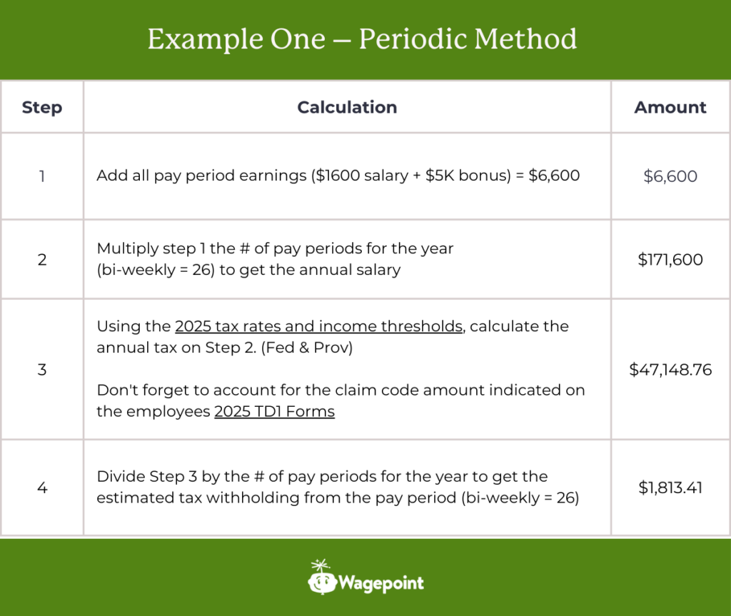 Using the periodic method, the employee would pay $1,813.41 in income tax. Using the bonus method, the tax withheld would be $1,002.50
